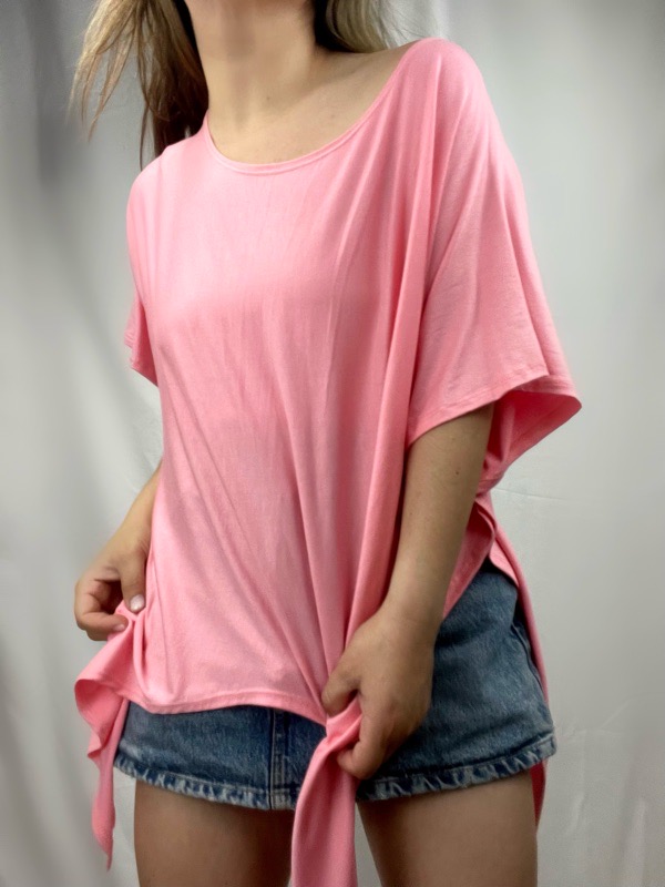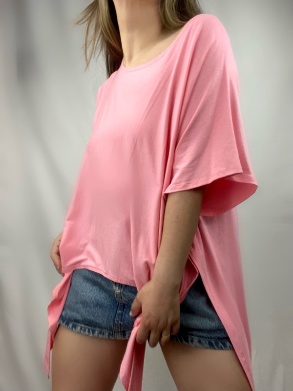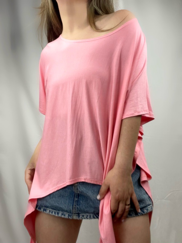 Polera Rosada Inti Modal, Polera oversize confeccionada en algodón modal elasticado, de textura suave, fresca y liviana. Su diseño destaca por la caída en punta frontal y posterior, que permite amarrarla de distintas maneras: al centro, lateral o suelta, adaptando el calce y el estilo según tu look. Cuenta con escote amplio tipo bote, ideal para llevarla caída sobre un hombro, y manga corta suelta, que aporta movimiento y comodidad. Su calce holgado se adapta a distintas siluetas sin marcar, convirtiéndola en una prenda versátil y muy favorecedora. Perfecta para usar con shorts, jeans, leggings o como mini vestido, tanto de día como de noche. Oversize cede hasta XXL.