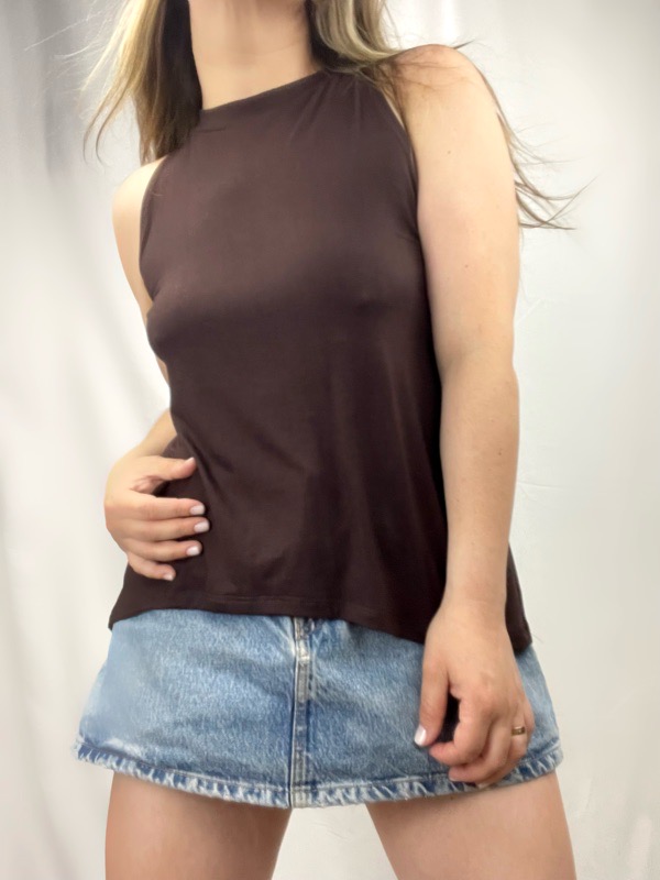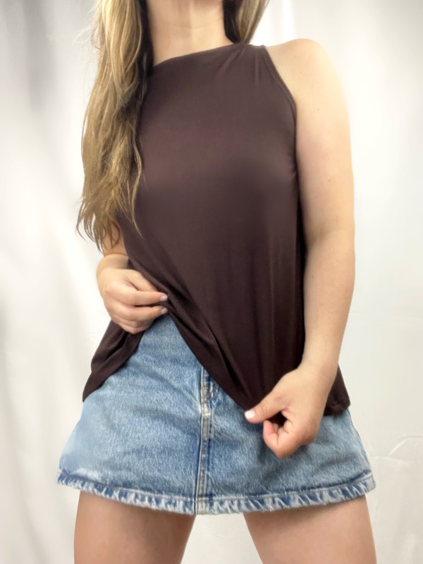 Polera Cafe Sin Mangas Algodón Modal Mujer. Polera confeccionada en algodón modal elasticado, suave, liviano y fresco. Su diseño sin mangas y escote cerrado tipo halter suave entrega un look limpio, moderno y muy cómodo. Tiene un calce holgado que cae de forma natural sin marcar el cuerpo, con largo recto ideal para usar suelta o ligeramente metida. Es una prenda básica imprescindible, versátil y atemporal, perfecta para el uso diario o para complementar looks más urbanos y minimalistas. Ideal para combinar con jeans, faldas, shorts o pantalones más estructurados. Talla Unica cede hasta L.
