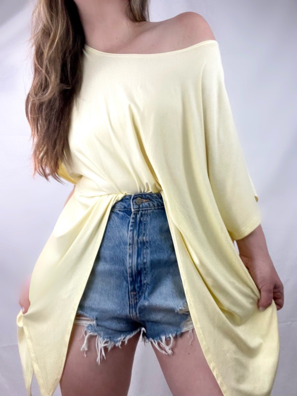 Polera Alma Modal Amarillo Pastel. Polera oversize confeccionada en algodón modal elasticado, suave, liviano y fresco. Su diseño destaca por el escote amplio tipo bote, ideal para llevarlo caído sobre un hombro, y por su manga ¾, que aporta comodidad y un estilo relajado pero femenino. Cuenta con calce holgado y largo ligeramente asimétrico, lo que permite una caída fluida que se adapta a distintas siluetas sin marcar. Es una prenda versátil, perfecta para el uso diario, combinable con jeans, faldas o shorts. Detalles Tela: Algodón modal elasticado, Calce: Oversize Cede hasta L, Escote: Amplio tipo bote, Manga: ¾, Largo: Levemente asimétrico, Estilo: Cómodo, femenino y atemporal