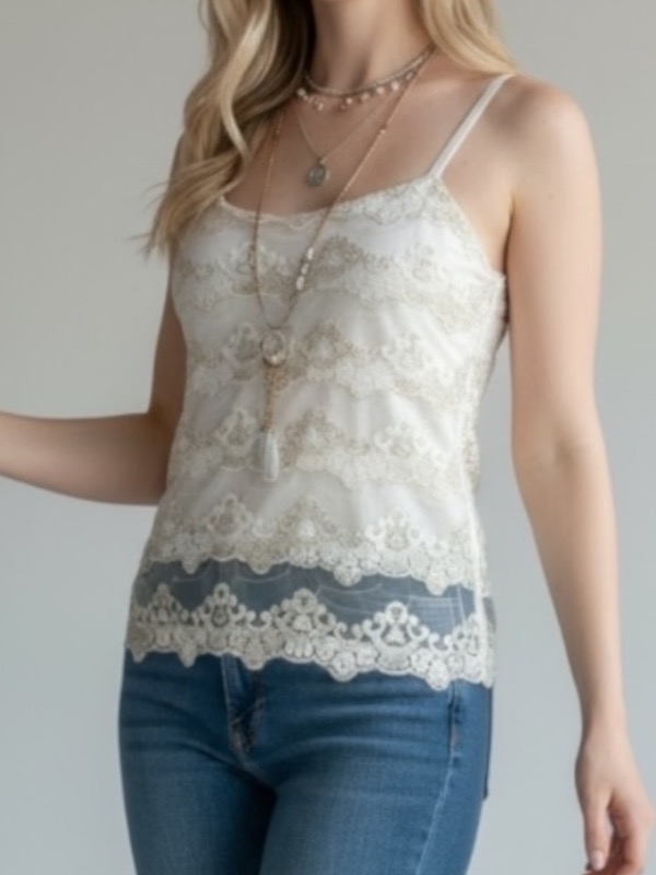 Blusa femenina de tirantes con delicado diseño de encaje y transparencia sutil, ideal para un look romántico y elegante. Su corte recto y liviano realza la figura sin marcar, aportando frescura y feminidad.