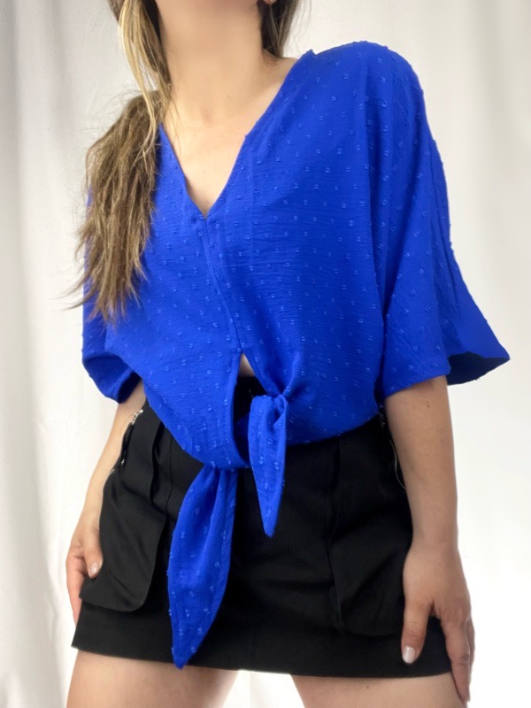 Hecha en tela liviana, con textura y caída fluida, ofrece un calce suelto y cómodo que cede hasta una talla L/XL. Su diseño con escote en “V” y nudo frontal ajustable estiliza la figura y permite adaptarla fácilmente a distintos estilos.