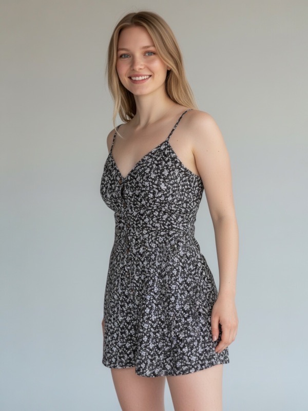 Enterito femenino de tirantes con escote en V y delicados botones frontales. Su diseño floral y su corte cómodo realzan la silueta con un estilo fresco y juvenil, ideal para días cálidos.