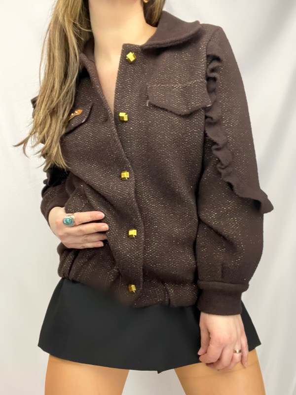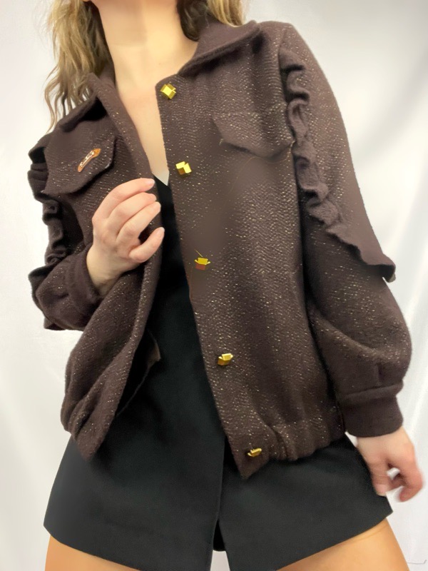 Nuestra Chaqueta Cafe Moro Fiorella viste de calidez este Invierno, su textura gruesa y suave abriga con elegancia, mientras que su ligero brillo dorado y los botones dorados le dan un toque de sofisticación sutil.