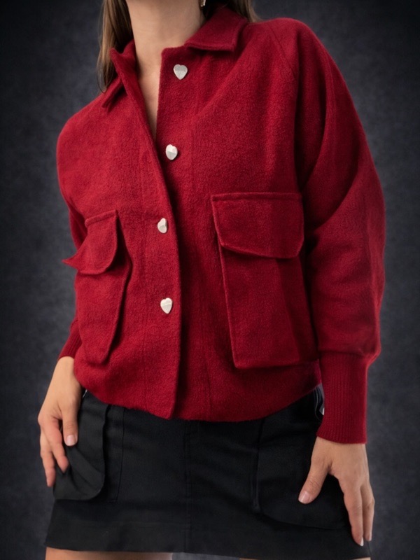 Su diseño corto y versátil la convierte en una pieza muy fácil de combinar, perfecta para usar con faldas, vestidos, pantalones o jeans. Destaca por sus botones frontales en forma de corazón, que le aportan un detalle delicado, diferente y muy especial, además de sus bolsillos delanteros tipo parche, que suman estilo y funcionalidad.