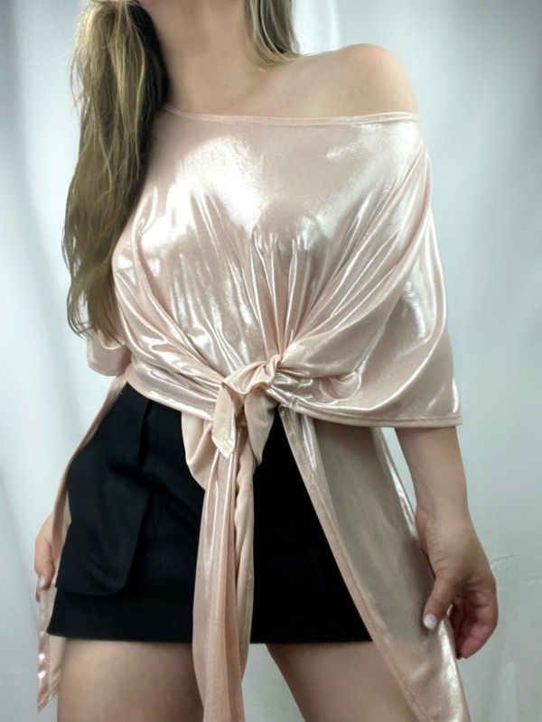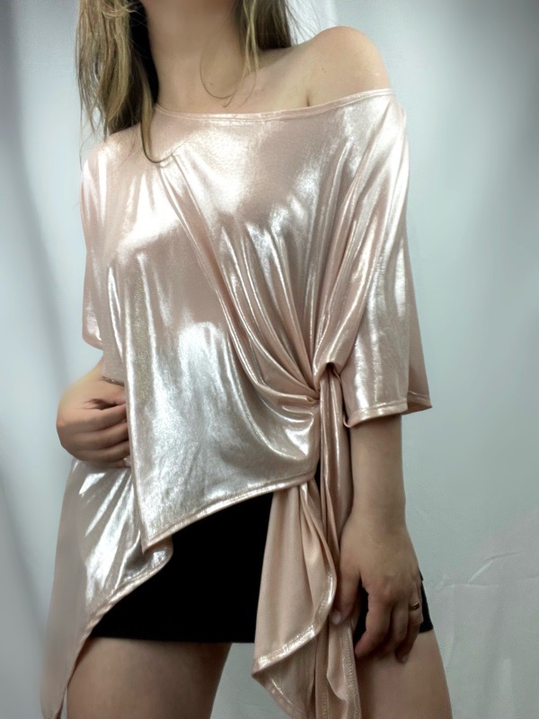 Polera oversize confeccionada en tela satinada elasticada, de acabado brillante y tacto suave. Su diseño destaca por una caída fluida con amarre lateral, que permite ajustar y drapear la prenda de forma natural, creando un efecto favorecedor y femenino.