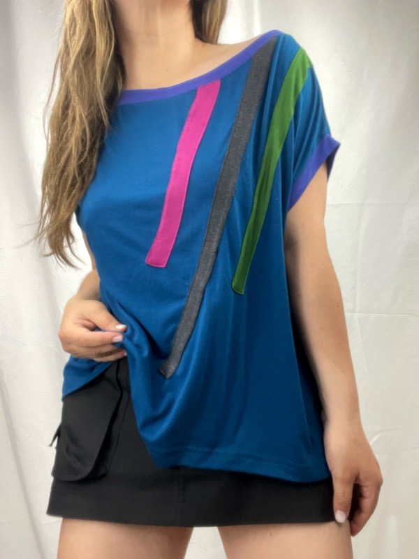 Polera oversize de creación nacional, confeccionada en algodón modal elasticado, suave, liviano y muy cómodo. Su diseño destaca por aplicaciones geométricas en contraste sobre el delantero, que aportan un estilo moderno y artístico.