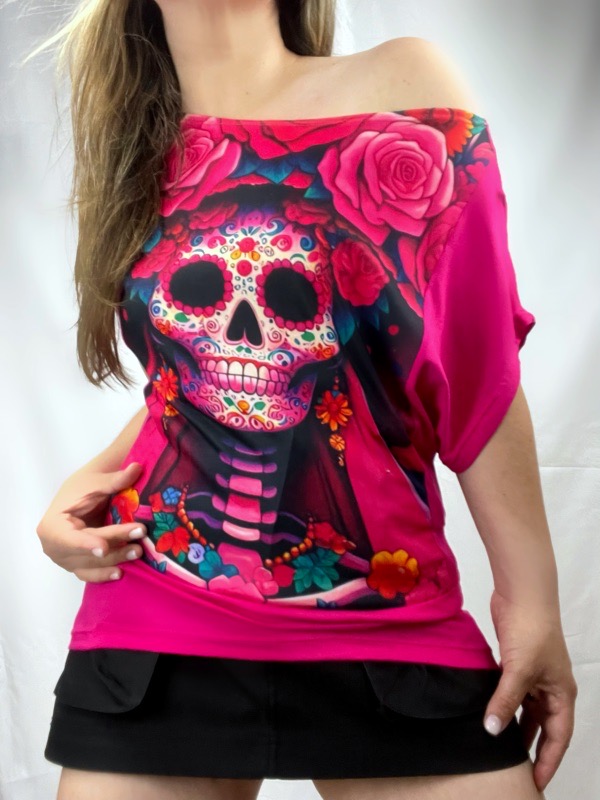 Polera de diseño exclusivo confeccionada en algodón modal elasticado, de textura suave, liviana y excelente caída. Presenta manga corta estilo murciélago, hombros semi descubiertos y pretina inferior que aporta estructura y comodidad sin ajustar. Su estampado artístico frontal, inspirado en la estética mexicana y el simbolismo del Día de los Muertos, transforma la prenda en una pieza expresiva y de carácter único. El color fucsia aporta intensidad, feminidad y un sello contemporáneo, ideal para looks relajados o protagonistas.