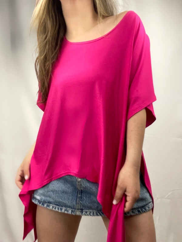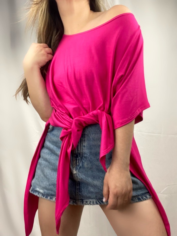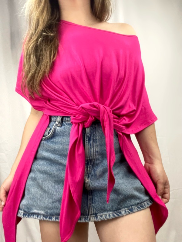 Polera oversize confeccionada en algodón modal elasticado, de textura suave, fresca y liviana. Su diseño destaca por la caída en punta frontal y posterior, que permite amarrarla de distintas maneras: al centro, lateral o suelta, adaptando el calce y el estilo según tu look.
