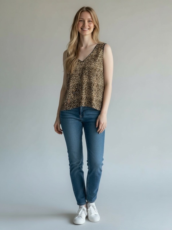 Polera femenina sin mangas con escote en V y estampado animal print, ideal para un look moderno y con actitud. Su corte suelto estiliza la figura sin marcar, aportando comodidad y frescura.