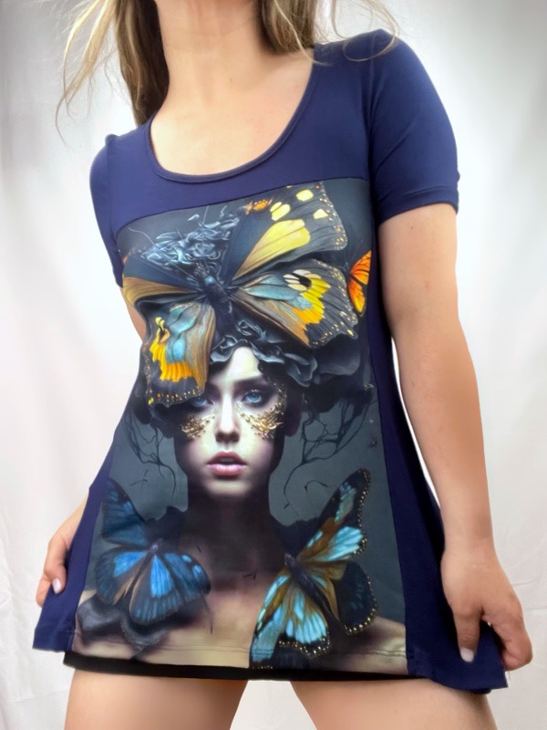 Polera femenina confeccionada en algodón modal elasticado, suave, liviano y muy cómodo. Su diseño destaca por un panel frontal sublimado con ilustración artística de rostro femenino y mariposas en tonos azules y dorados, que aporta profundidad, carácter y un estilo único.