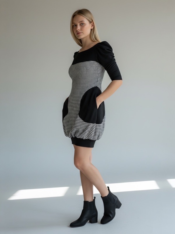 Vestido corto de diseño moderno con combinación de tela lisa y estampado cuadrillé. Su corte tipo globo estiliza la figura y aporta un look original y femenino, mientras sus bolsillos laterales entregan comodidad y funcionalidad.