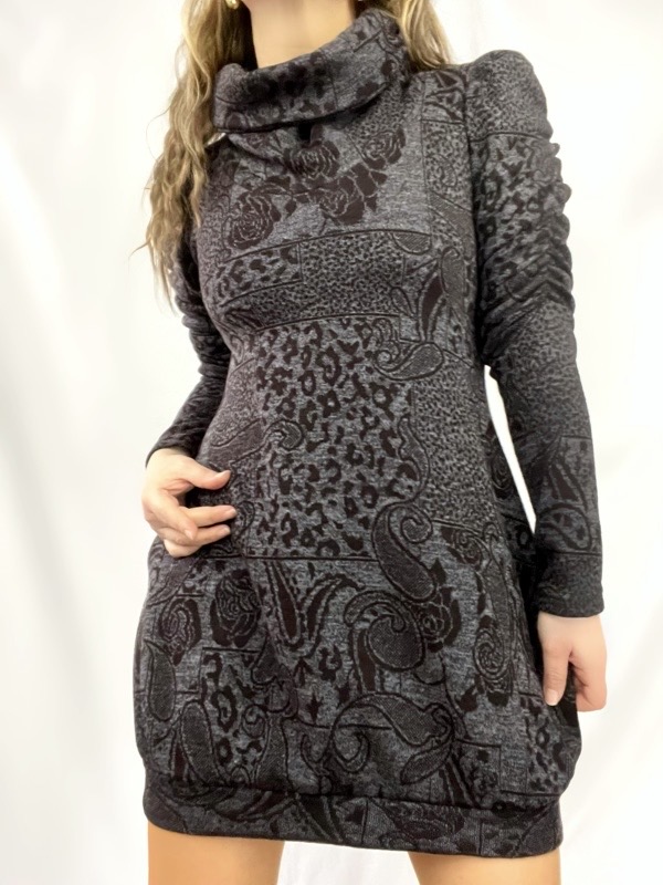 Elegante y lleno de carácter, confeccionado en lanilla gruesa para brindar abrigo y estructura. Su tela luce un estampado barroco único que mezcla motivos florales, animal print y detalles paisley en tonos gris y burdeos, creando un diseño sofisticado y con personalidad.