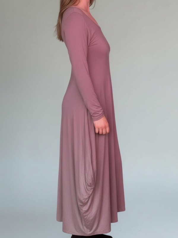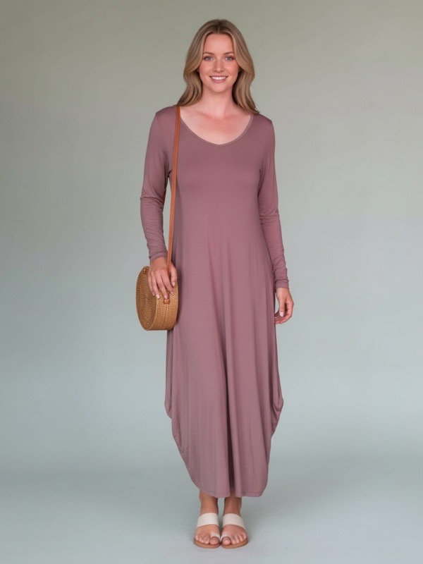 Vestido largo de corte evasé con escote en V y manga larga, ideal para un look cómodo, femenino y elegante. Su caída fluida estiliza la silueta sin marcar, adaptándose suavemente al cuerpo.