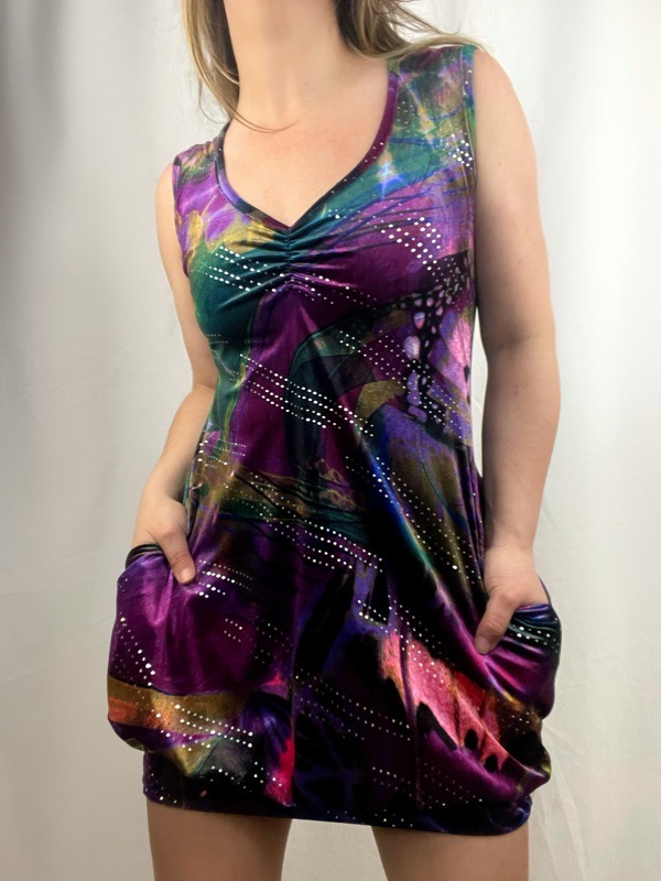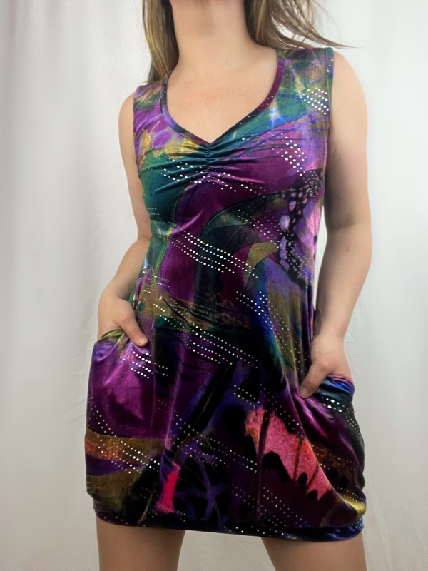 Nuestro Francis es pura elegancia moderna. Su diseño semi-englobado abraza la figura con sutileza, destacando la cintura y dando un toque coqueto al ruedo. Confeccionado en tela morada estampada de terciopelo de suave textura y sutiles brillos que capturan la luz en cada movimiento, aportando ese brillo discreto pero irresistible.