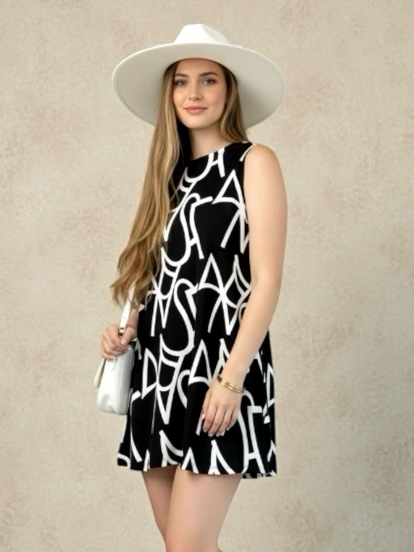 Su diseño sin mangas y escote cerrado lo convierte en un vestido versátil, ideal para usar tanto de día como de noche, adaptándose fácilmente a distintas ocasiones. El contraste en blanco y negro le da un aire contemporáneo y elegante, perfecto para quienes buscan un look actual, cómodo y con personalidad.