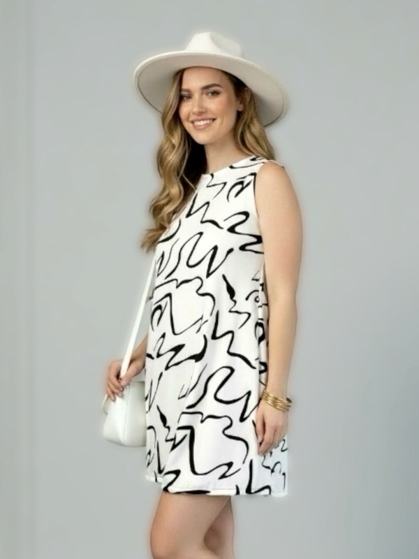 Su diseño sin mangas y escote cerrado lo convierte en un vestido versátil, ideal para usar tanto de día como de noche, adaptándose fácilmente a distintas ocasiones. El contraste en blanco y negro le da un aire contemporáneo y elegante, perfecto para quienes buscan un look actual, cómodo y con personalidad.